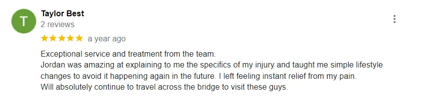 "Exceptional service and treatment from the team. I left feeling instant relief from my pain. Will absolutely continue to travel across the bridge to visit these guys."